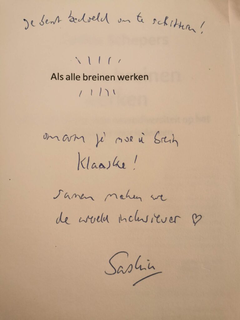 Als alle breinen werken heet haar boek en daarin legt ze veel uit. Het is een feest der herkenning. In het boek is ook een breinhandleiding opgenomen. Die is heel handig om met collega’s kort te praten hoe het werk voor jou en de ander het beste werkt. Zo houdt niet iedereen van appen na werktijd en zijn er mensen die liever de ander spreken via zoom in plaats van live. Deze breinhandleiding kan je ook gratis downloaden vanaf haar website https://saskiaschepers.com/ .